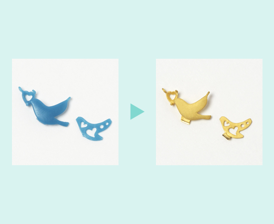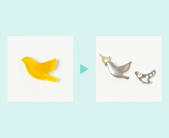 シルバーの原型が完成すると、原型を元に実際の製品として制作する作業が始まります。ゴールドやプラチナ、希望の地金で原型と同じものを生産します。磨く前の金属の肌は、普段目にしているジュエリーとは、違う印象。